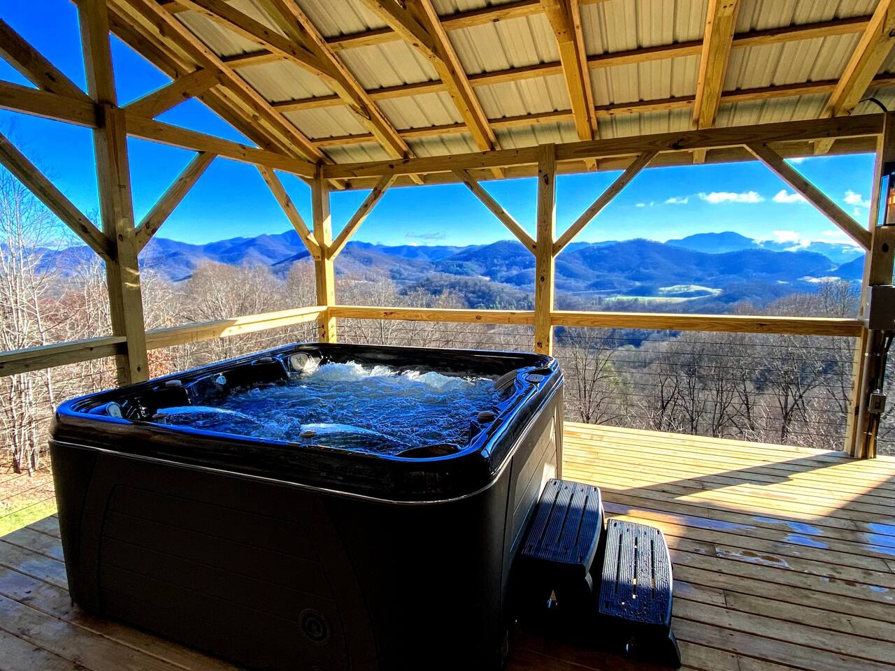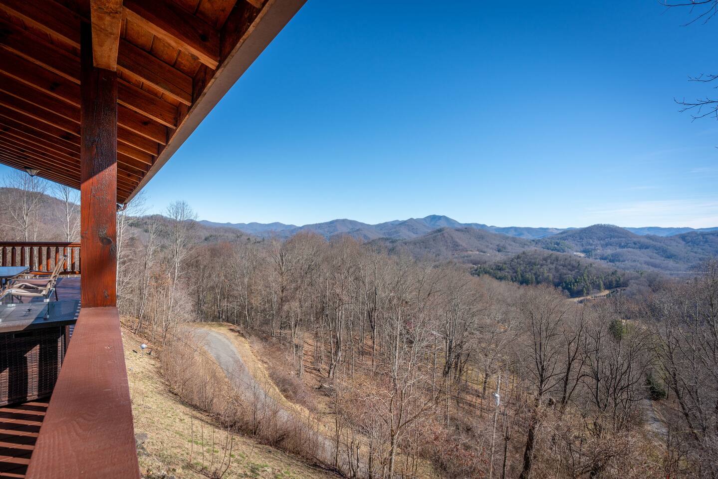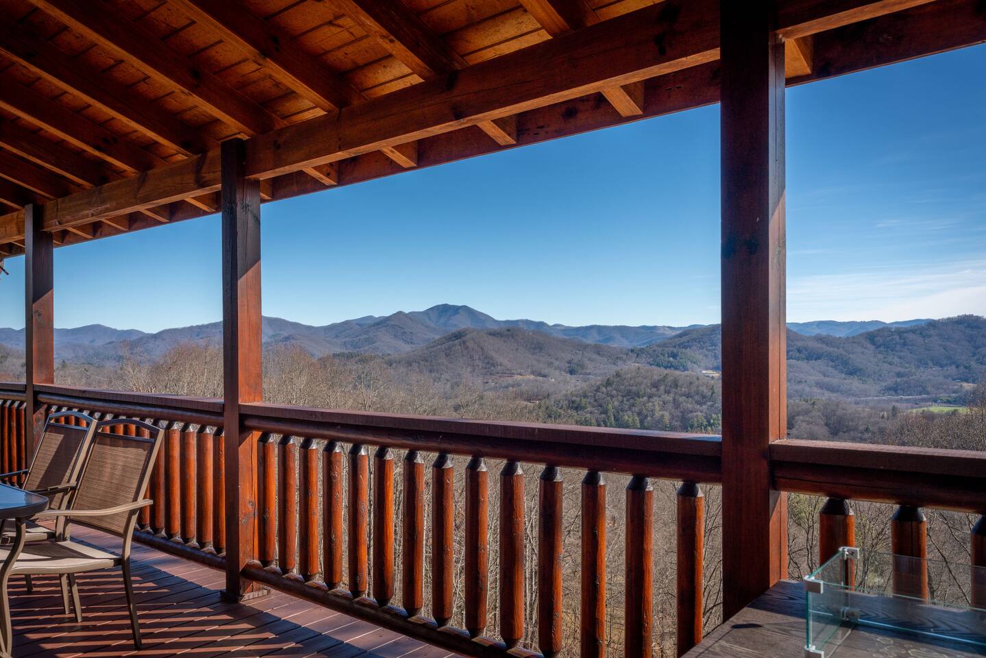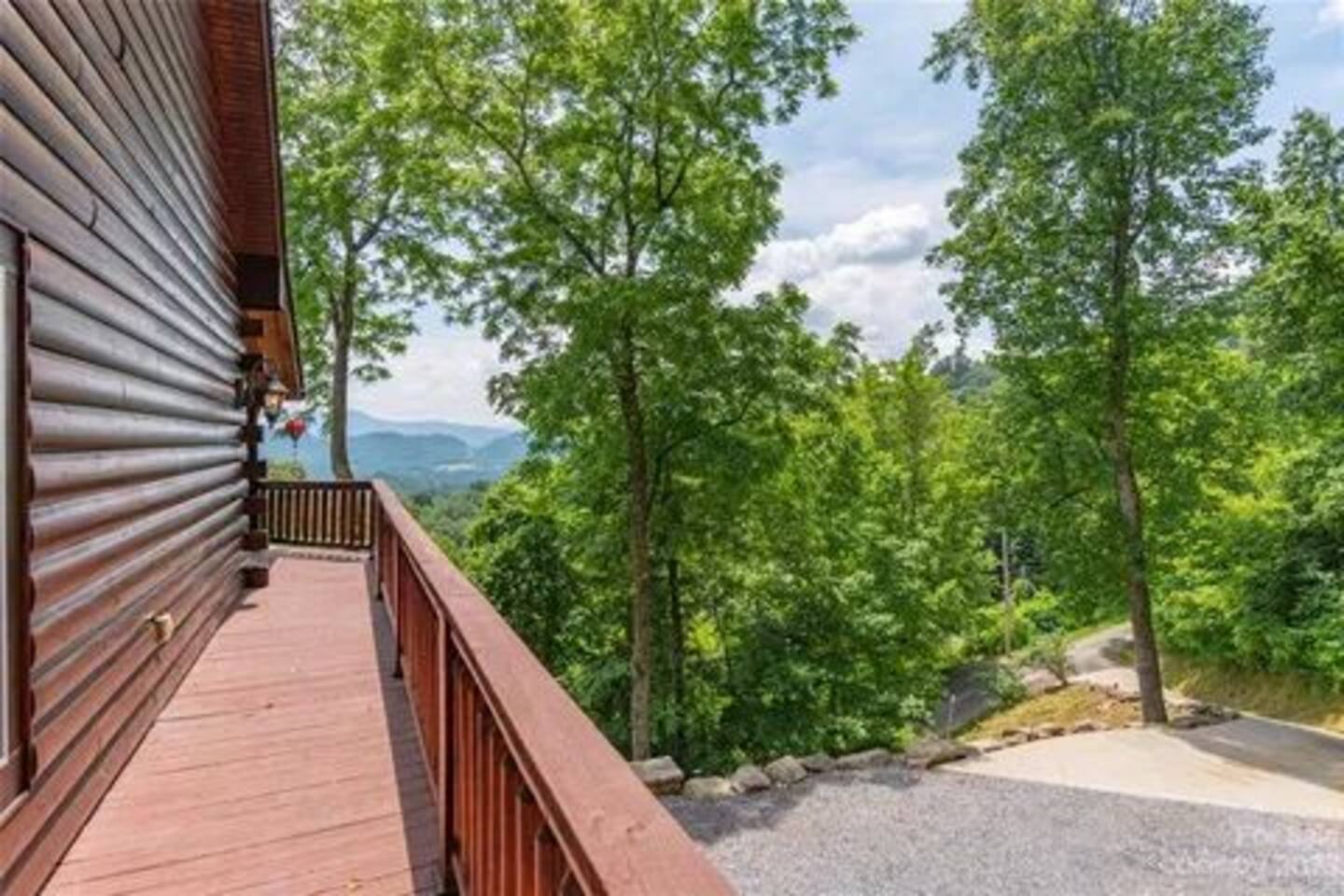 2,750 Sq Ft | Big Bear Lodge, Grand Double Deck, Magnificent Views, Large Gazebo with Hot Tub, Gas Fireplace Excellent Cell Service, Reliable Wi-Fi (for remote workers), paved/maintained roads to cabin, driveway is rough concrete/inclined and not recommended for motorcycles/trailers. 1King/2 Queens/Bunk Beds Hike, golf, ski, shop, or simply kick back with your closest friends and family with the Great Smoky Mountains as your backdrop at this luxurious Waynesville cabin! Bedroom 1: King Bed | Bedroom 2: Queen Bed | Bedroom 3: Bunk Beds | Bedroom 4: Queen Bed OUTDOOR LIVING: Grand Double Deck, Views of the Smokies/Blue Ridge Mountains, patio/lounge furniture, fire table, propane grill. NEW Gazebo with hot tub. INDOOR LIVING: Chef’s kitchen, 5 SmartTV's, (cable/streaming) gas fireplace, books/games, ensuite bathroom w/ jetted tub & walk-in shower, open-concept layout, natural light. Spacious loft with wet bar and extra seating for dining/games/puzzles. Loft also has 2 Bedrooms with bath and double sinks. KITCHEN: Fully equipped, granite counter, gas stove, Keurig & drip coffee makers, tea kettle, microwave, toaster, toaster oven, Crockpot, blender, waffle maker, cooking utensils, pots & pans, ice maker, spices, dishware & flatware GENERAL: Free Wi-Fi, ceiling fans, central heat & A/C, towels/linens, washer/dryer, hair dryer FAQ: Exterior security cameras (facing out), 1st-level to driveway PARKING: Gravel driveway (3 vehicles) Other things to note: In addition to the nightly rate, the following fees will apply: $175 Cleaning Fee (includes extensive cleaning and turnover before every guest) $100 Pet Fee – (1 DOG LIMIT – 50lbs) 11% Tax – NC State & Haywood County Taxes. Just 25 minutes to the Blue Ridge Parkway Just 25 minutes to Cataloochee Ski Resort 40 minutes to Harrah's Casino in Cherokee 45 minutes to the Great Smoky Mountain National Park 40 minutes to Asheville's famous BILTMORE HOUSE 20 minutes to Waynesville 15 minutes to Maggie Valley Festival Grounds This cabin has enhanced CDC cleaning measures that are implemented. The property is cleaned with disinfectant and contactless check-in and out.