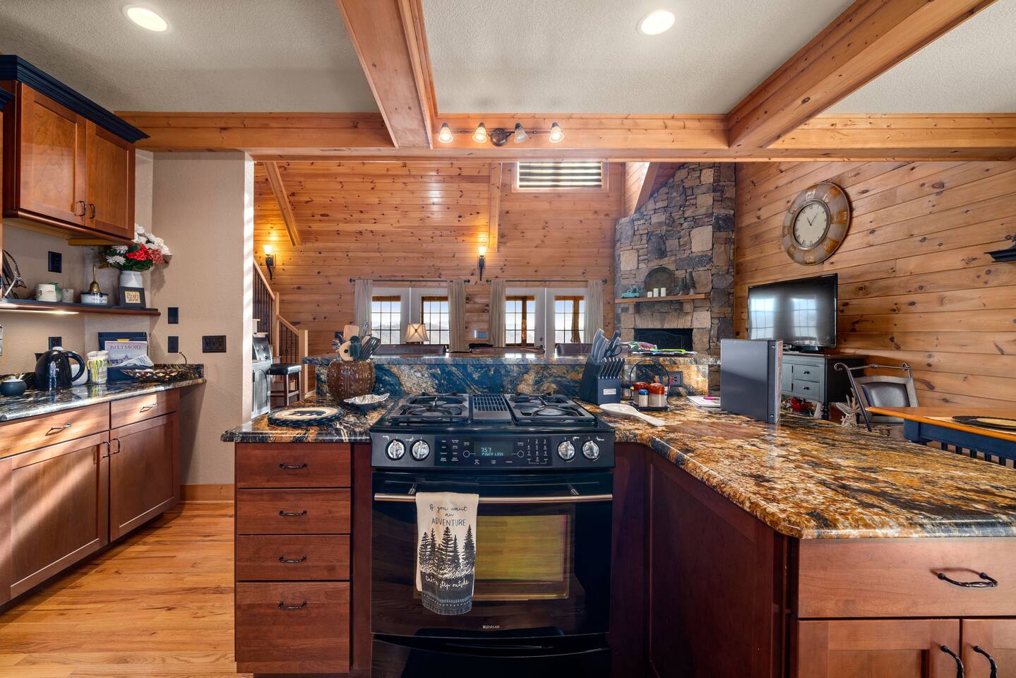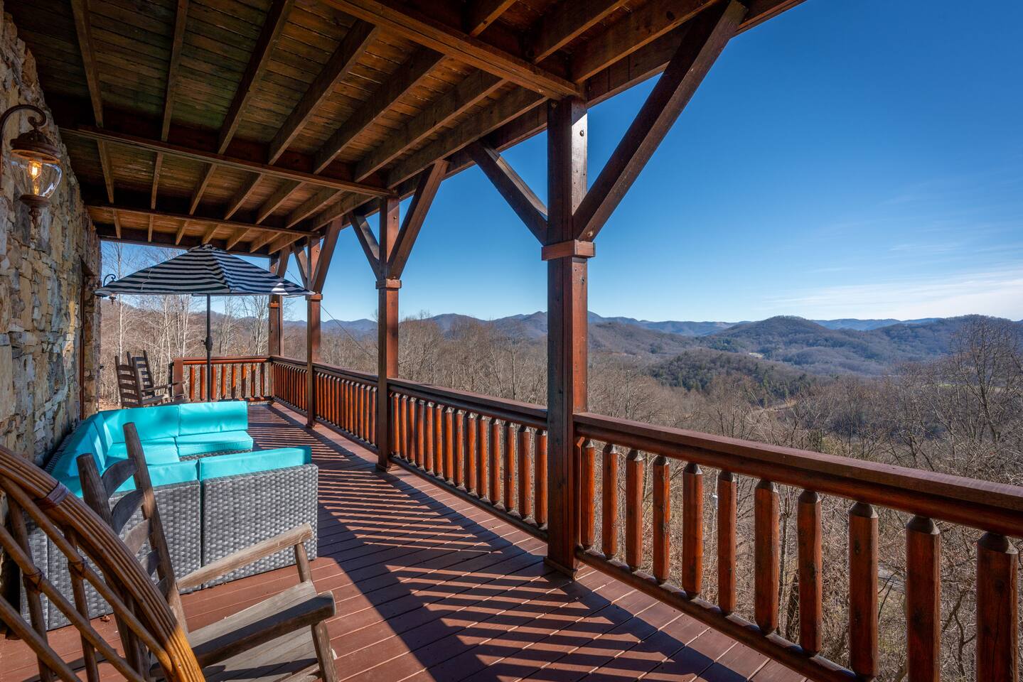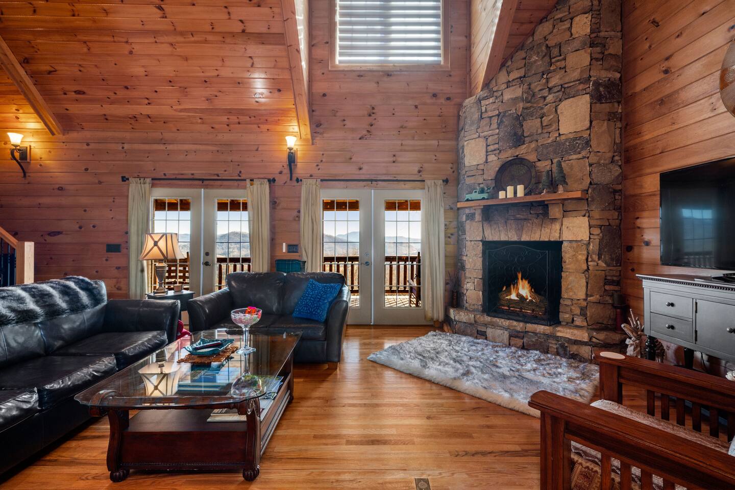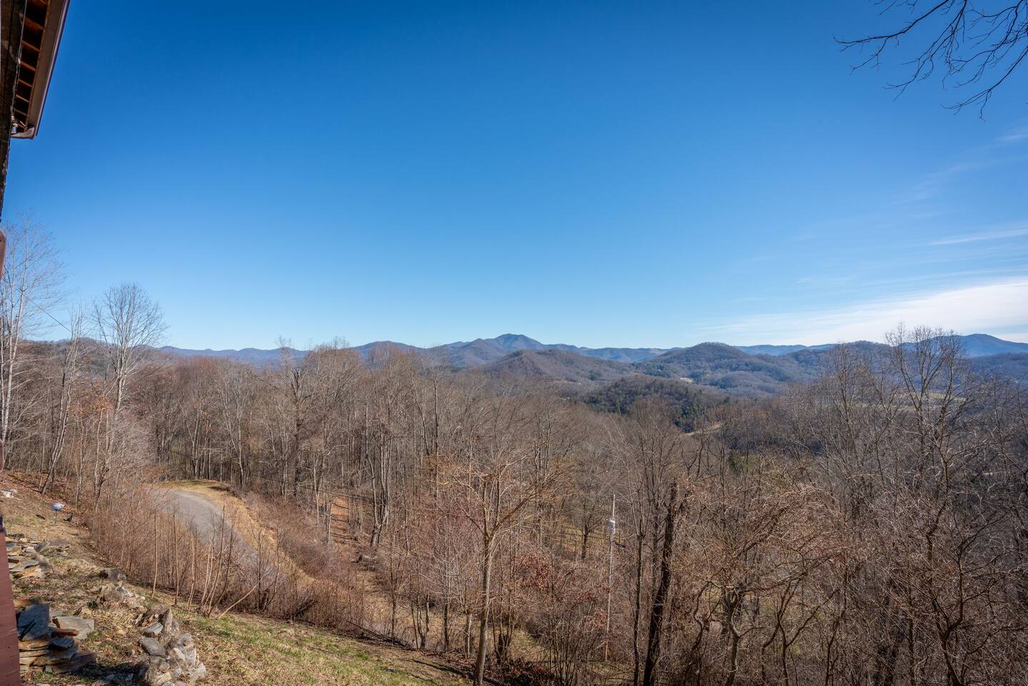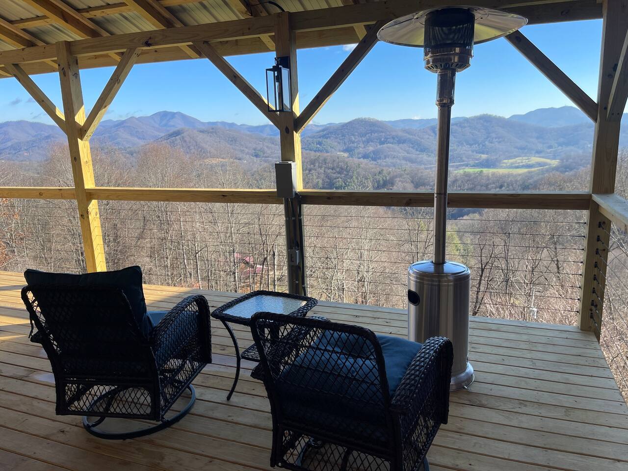 2,750 Sq Ft | Big Bear Lodge, Grand Double Deck, Magnificent Views, Large Gazebo with Hot Tub, Gas Fireplace Excellent Cell Service, Reliable Wi-Fi (for remote workers), paved/maintained roads to cabin, driveway is rough concrete/inclined and not recommended for motorcycles/trailers. 1King/2 Queens/Bunk Beds Hike, golf, ski, shop, or simply kick back with your closest friends and family with the Great Smoky Mountains as your backdrop at this luxurious Waynesville cabin! Bedroom 1: King Bed | Bedroom 2: Queen Bed | Bedroom 3: Bunk Beds | Bedroom 4: Queen Bed OUTDOOR LIVING: Grand Double Deck, Views of the Smokies/Blue Ridge Mountains, patio/lounge furniture, fire table, propane grill. NEW Gazebo with hot tub. INDOOR LIVING: Chef’s kitchen, 5 SmartTV's, (cable/streaming) gas fireplace, books/games, ensuite bathroom w/ jetted tub & walk-in shower, open-concept layout, natural light. Spacious loft with wet bar and extra seating for dining/games/puzzles. Loft also has 2 Bedrooms with bath and double sinks. KITCHEN: Fully equipped, granite counter, gas stove, Keurig & drip coffee makers, tea kettle, microwave, toaster, toaster oven, Crockpot, blender, waffle maker, cooking utensils, pots & pans, ice maker, spices, dishware & flatware GENERAL: Free Wi-Fi, ceiling fans, central heat & A/C, towels/linens, washer/dryer, hair dryer FAQ: Exterior security cameras (facing out), 1st-level to driveway PARKING: Gravel driveway (3 vehicles) Other things to note: In addition to the nightly rate, the following fees will apply: $175 Cleaning Fee (includes extensive cleaning and turnover before every guest) $100 Pet Fee – (1 DOG LIMIT – 50lbs) 11% Tax – NC State & Haywood County Taxes. Just 25 minutes to the Blue Ridge Parkway Just 25 minutes to Cataloochee Ski Resort 40 minutes to Harrah's Casino in Cherokee 45 minutes to the Great Smoky Mountain National Park 40 minutes to Asheville's famous BILTMORE HOUSE 20 minutes to Waynesville 15 minutes to Maggie Valley Festival Grounds This cabin has enhanced CDC cleaning measures that are implemented. The property is cleaned with disinfectant and contactless check-in and out.