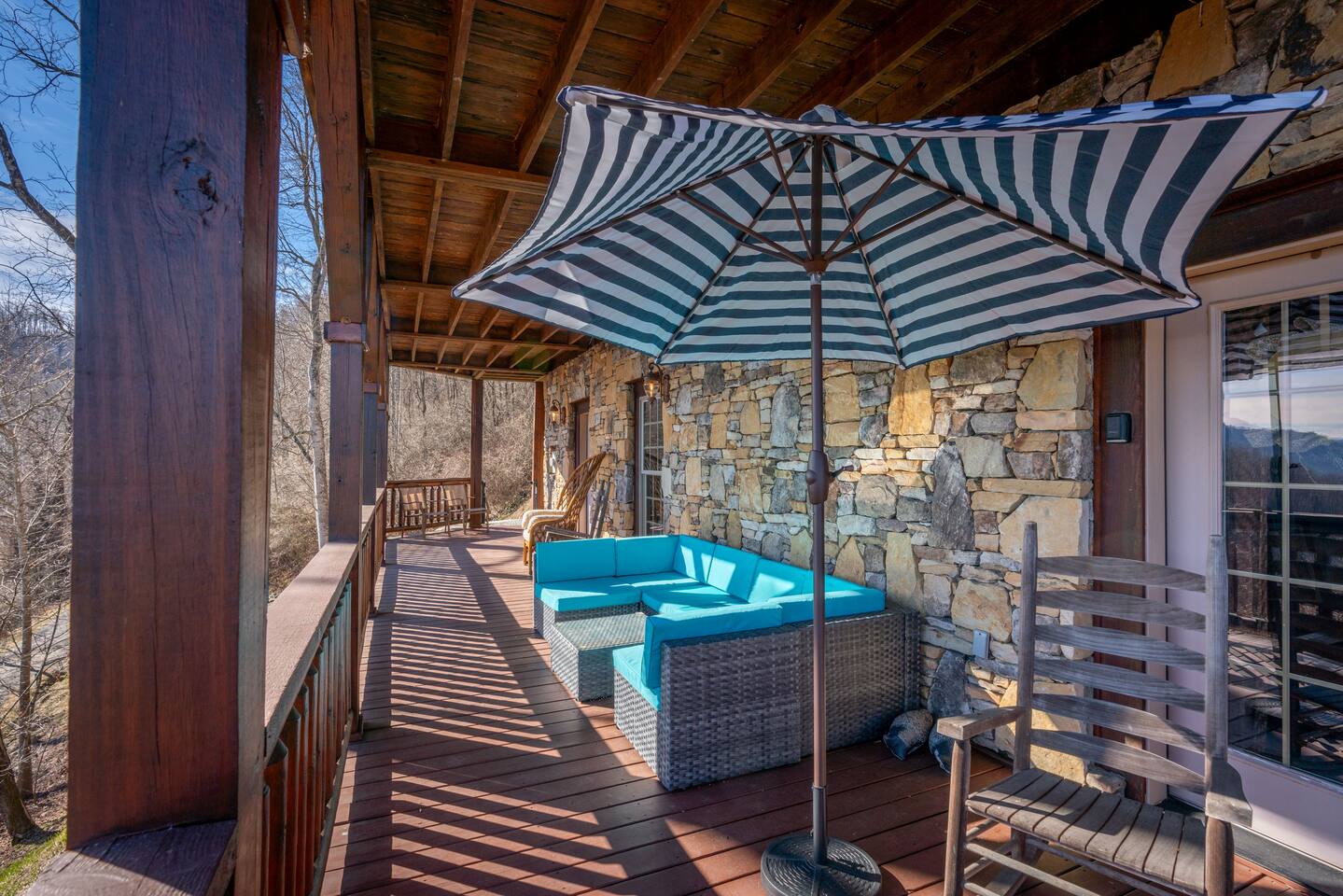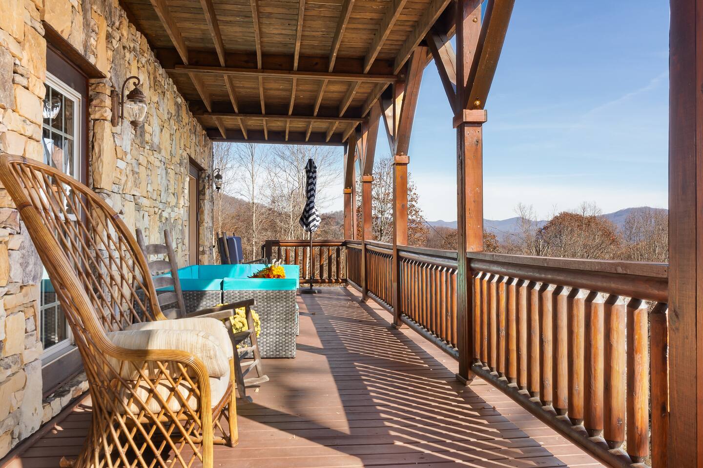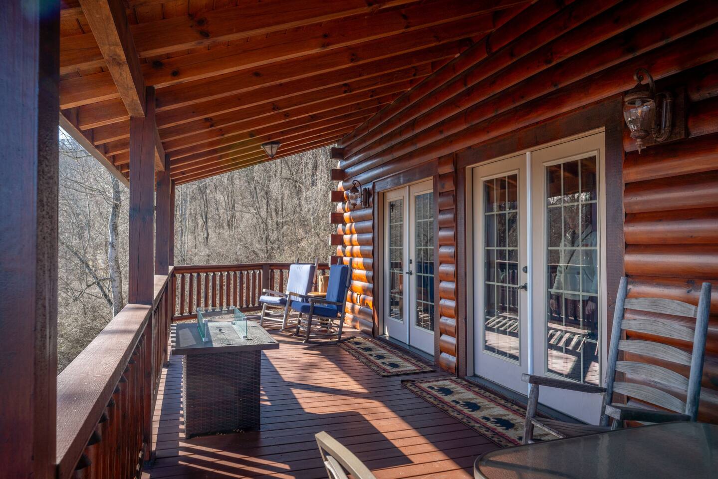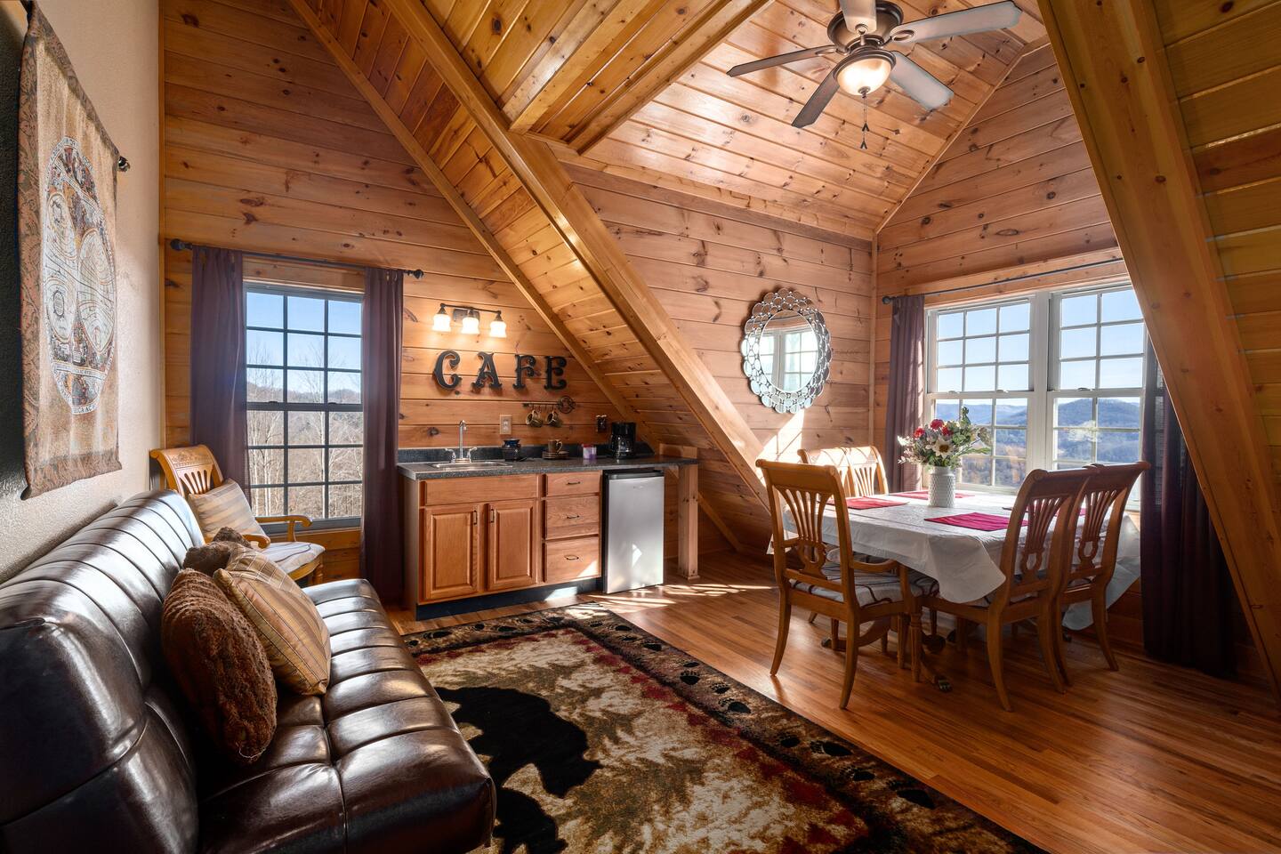 2,750 Sq Ft | Big Bear Lodge, Grand Double Deck, Magnificent Views, Large Gazebo with Hot Tub, Gas Fireplace Excellent Cell Service, Reliable Wi-Fi (for remote workers), paved/maintained roads to cabin, driveway is rough concrete/inclined and not recommended for motorcycles/trailers. 1King/2 Queens/Bunk Beds Hike, golf, ski, shop, or simply kick back with your closest friends and family with the Great Smoky Mountains as your backdrop at this luxurious Waynesville cabin! Bedroom 1: King Bed | Bedroom 2: Queen Bed | Bedroom 3: Bunk Beds | Bedroom 4: Queen Bed OUTDOOR LIVING: Grand Double Deck, Views of the Smokies/Blue Ridge Mountains, patio/lounge furniture, fire table, propane grill. NEW Gazebo with hot tub. INDOOR LIVING: Chef’s kitchen, 5 SmartTV's, (cable/streaming) gas fireplace, books/games, ensuite bathroom w/ jetted tub & walk-in shower, open-concept layout, natural light. Spacious loft with wet bar and extra seating for dining/games/puzzles. Loft also has 2 Bedrooms with bath and double sinks. KITCHEN: Fully equipped, granite counter, gas stove, Keurig & drip coffee makers, tea kettle, microwave, toaster, toaster oven, Crockpot, blender, waffle maker, cooking utensils, pots & pans, ice maker, spices, dishware & flatware GENERAL: Free Wi-Fi, ceiling fans, central heat & A/C, towels/linens, washer/dryer, hair dryer FAQ: Exterior security cameras (facing out), 1st-level to driveway PARKING: Gravel driveway (3 vehicles) Other things to note: In addition to the nightly rate, the following fees will apply: $175 Cleaning Fee (includes extensive cleaning and turnover before every guest) $100 Pet Fee – (1 DOG LIMIT – 50lbs) 11% Tax – NC State & Haywood County Taxes. Just 25 minutes to the Blue Ridge Parkway Just 25 minutes to Cataloochee Ski Resort 40 minutes to Harrah's Casino in Cherokee 45 minutes to the Great Smoky Mountain National Park 40 minutes to Asheville's famous BILTMORE HOUSE 20 minutes to Waynesville 15 minutes to Maggie Valley Festival Grounds This cabin has enhanced CDC cleaning measures that are implemented. The property is cleaned with disinfectant and contactless check-in and out.